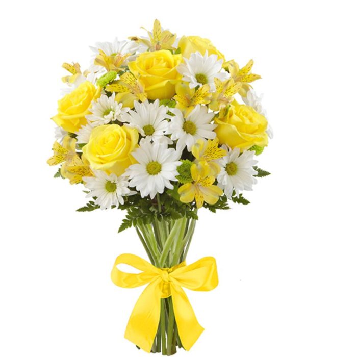 Папоротник – 1 шт.хризантема кустовая (белый) – 3 шт.альстромерия (желтый) – 3 шт.лента атласная (желтый) – 1 шт.