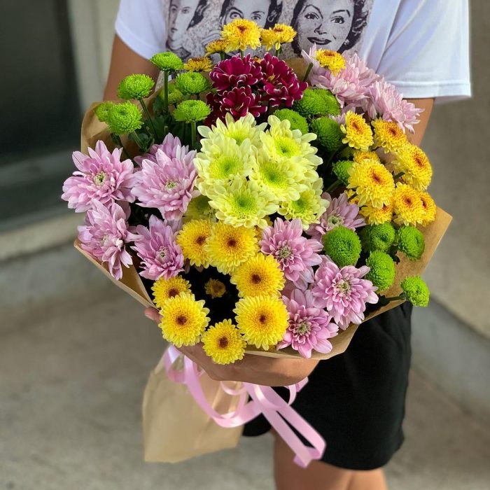 Яркий букетик из разноцветных хризантем в стильном оформлении бумаге крафт.