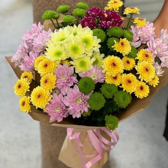 Хризантема кустовая желтая – 3 шт. Хризантема кустовая розовая – 3 шт. Хризантема зеленая кустовая – 3 шт. Хризантема кустовая бордовая – 1 шт. Хризантема кустовая лимонная – 1 шт.