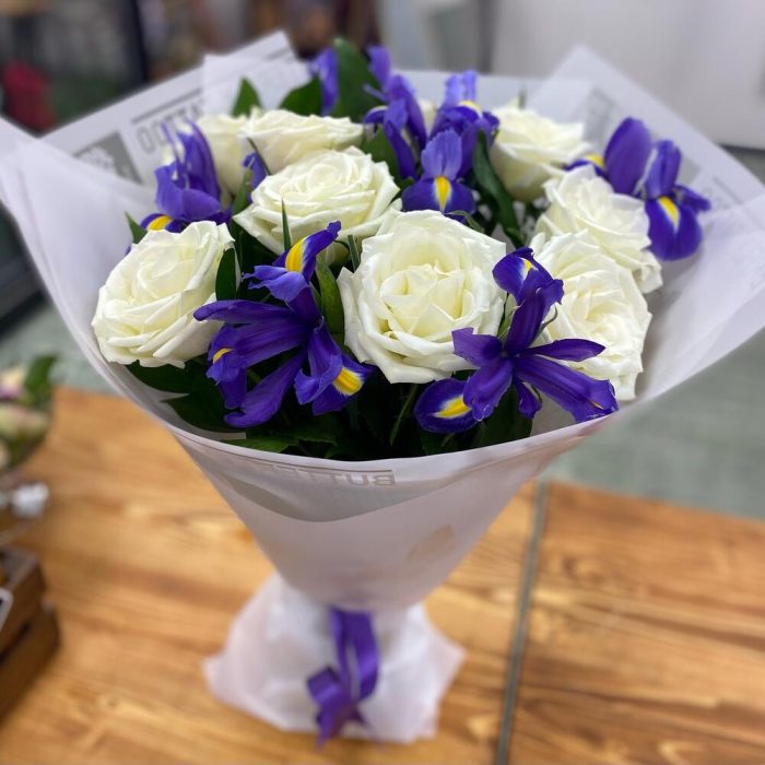 розы – 9 шт.ирисы – 6 шт.Рускус сочи – 9 шт.Упаковка дизайнерская – 1 шт.Лента – 1 шт.