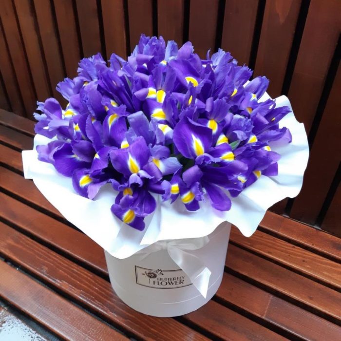 Красивый, яркий букет из 35 ирисов в белой шляпной коробке “Байкал”