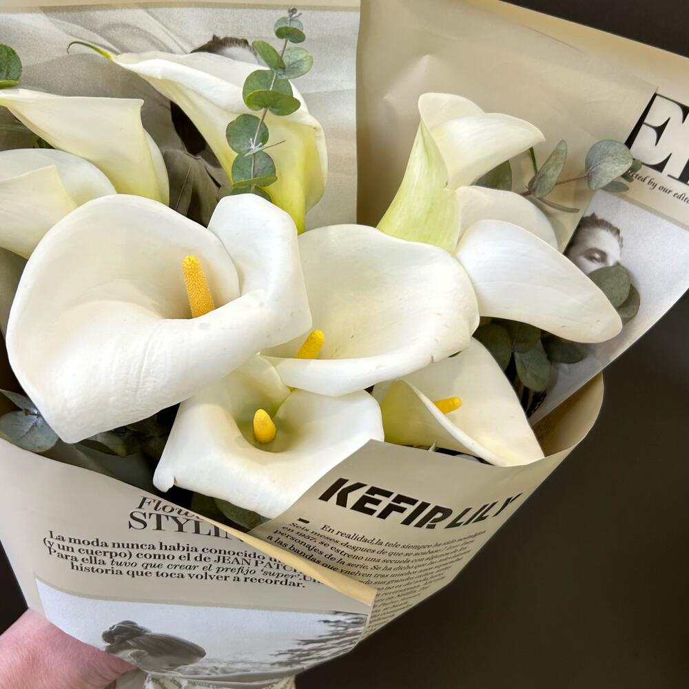 Букет из белой каллы и ароматного эвкалипта в упаковке