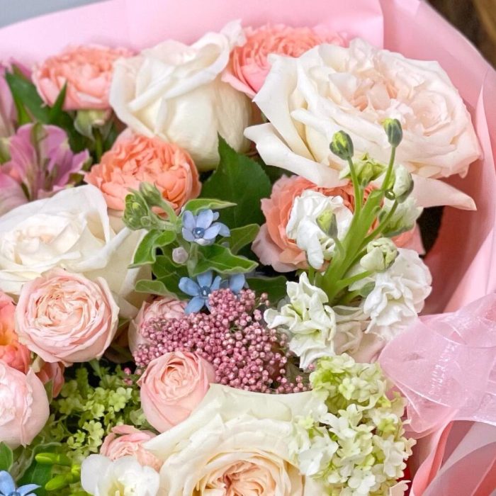 ароматные розы white o’hara – 5 шт.Незабудки – 3 шт.кустовые пионовидные розы – 3 шт.Кустовая роза – 1 шт.Маттиола – 3 шт.Альстромерия – 1 шт.Озотамнус – 1 шт.Фрезия – 1 шт.Вибурнум – 1 шт.Фисташка – 2 шт.Упаковка дизайнерская – 1 шт.