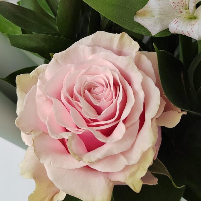 Альстромерия – 2 шт.Лента – 2 шт.Роза кустовая – 1 шт.Рускус – 3 шт.Роза – 1 шт.Упаковка – 1 шт.Эустома – 1 шт.