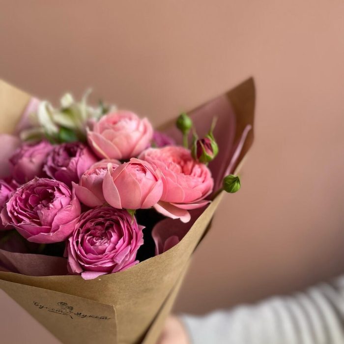 Альстромерия – 1 шт.Лента атласная – 1 шт.Тишью – 1 шт.Крафт – 1 шт.роза кустовая пионовидная кения – 3 шт.