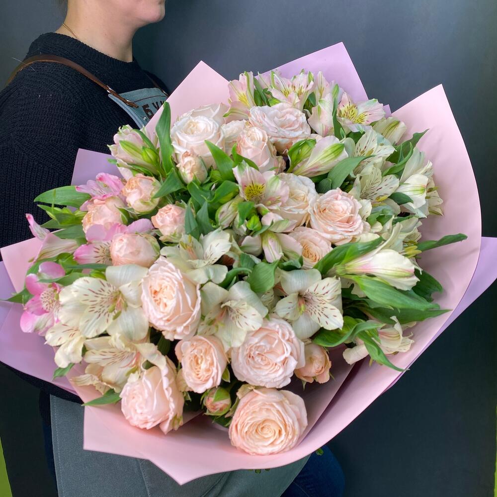 Альстромерия – 11 шт.Роза кустовая – 11 шт.Упаковка дизайнерская – 1 шт.