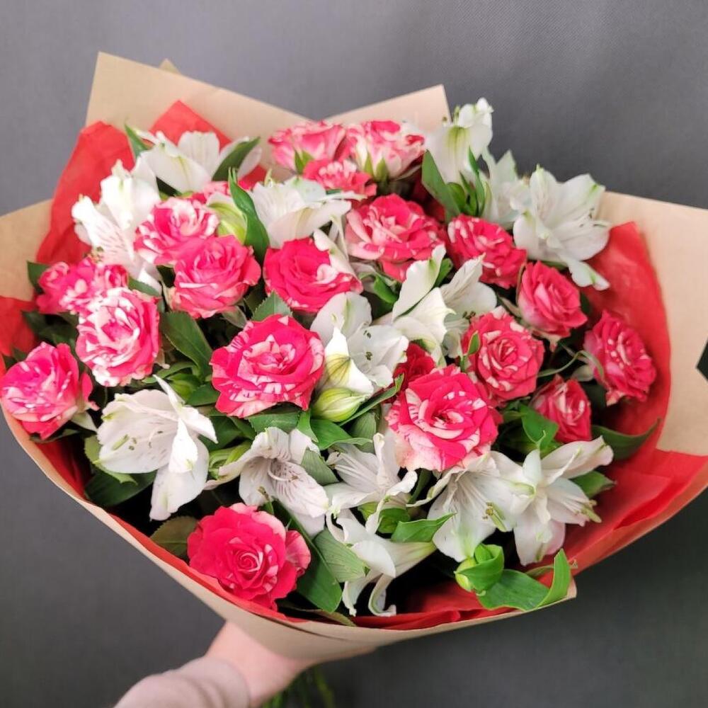 Роза кустовая – 3 шт.Альстромерия Микс Европа – 5 шт.Упаковка дизайнерская – 3 шт.