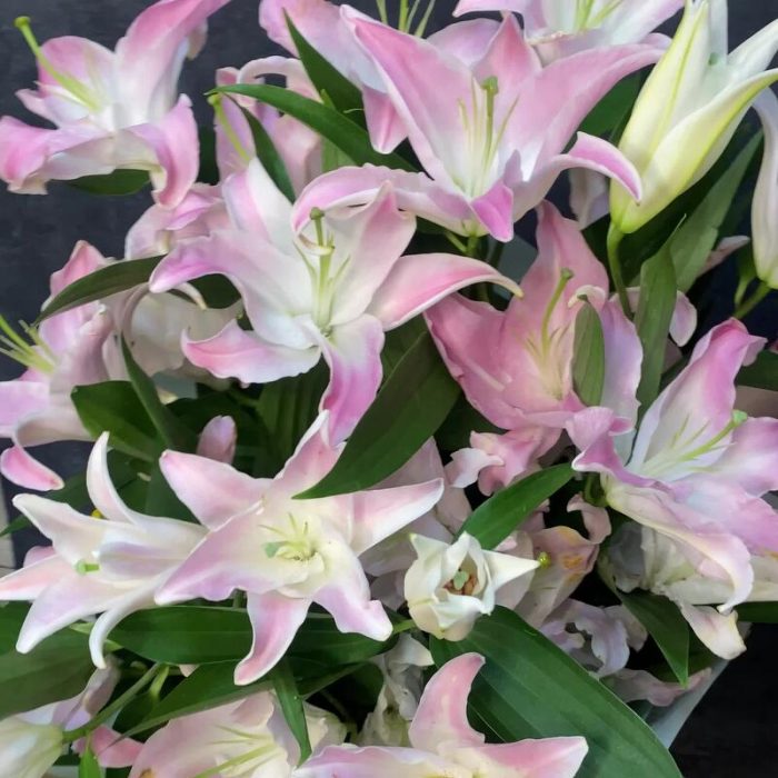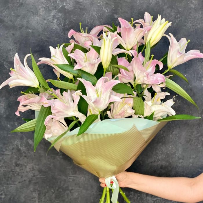 Лента атласная – 1 шт.Лилия розовая – 7 шт.Упаковка дизайнерская – 1 шт.