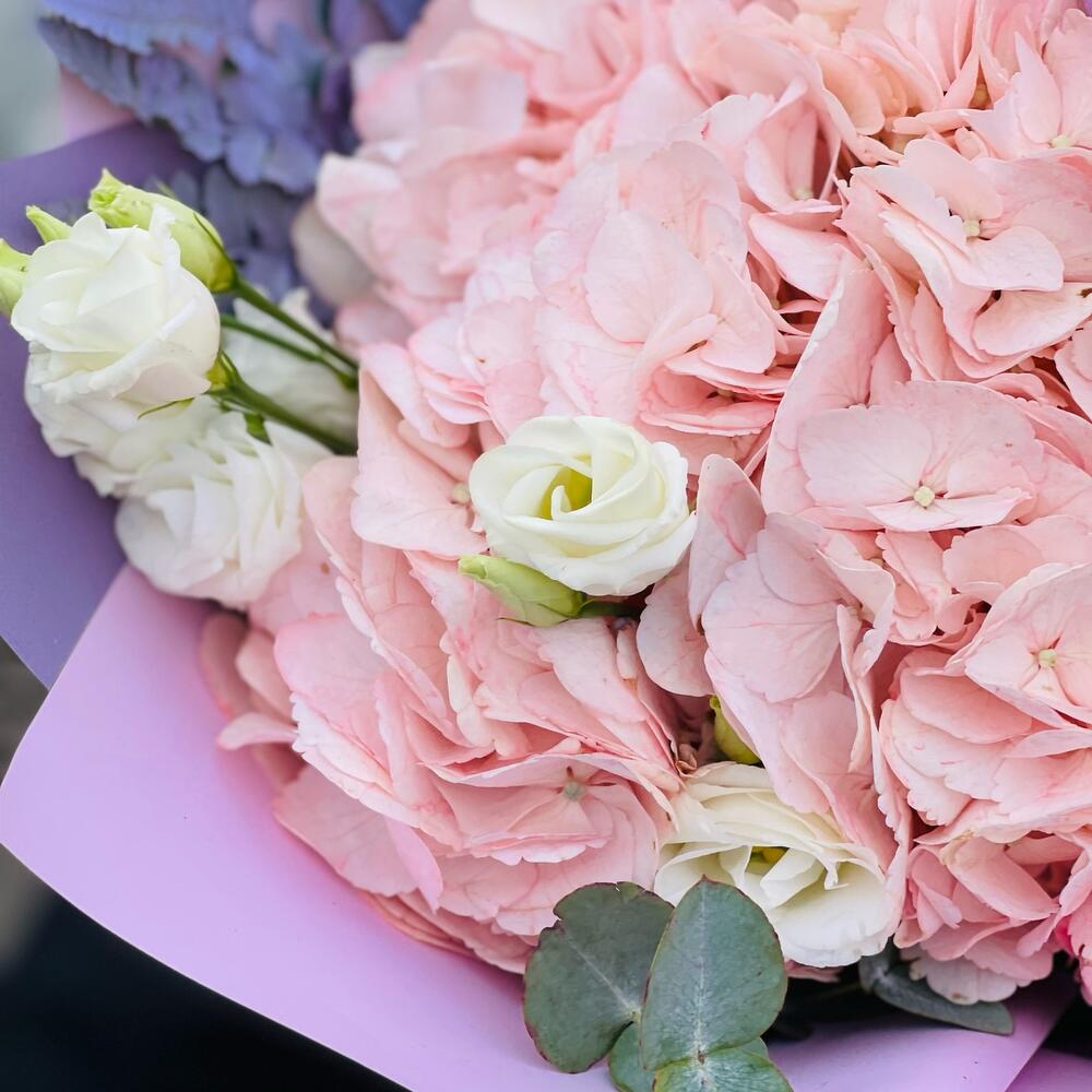 Гортензия – 1 шт.Маттиола – 1 шт.Папоротник – 2 шт.Эвкалипт – 5 шт.Эустома – 2 шт.Лента атласная – 1 шт.Упаковка дизайнерская – 5 шт.Бомбастик – 3 шт.