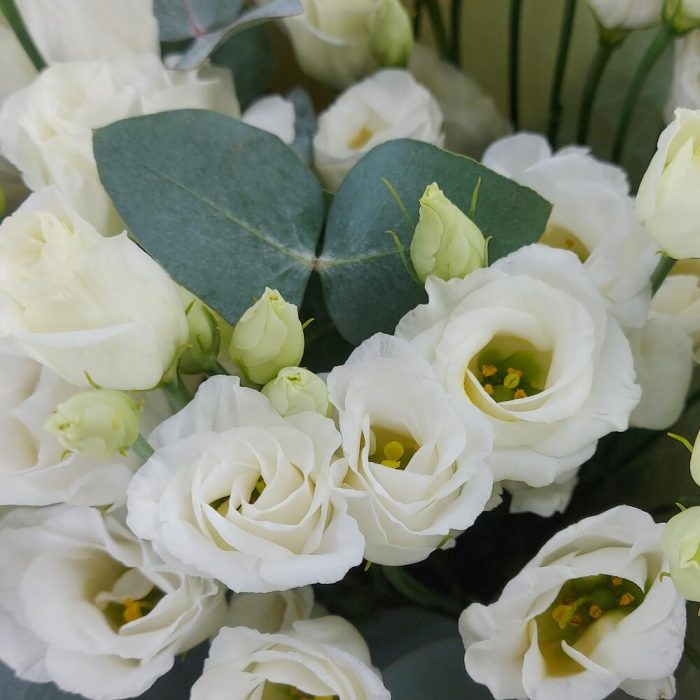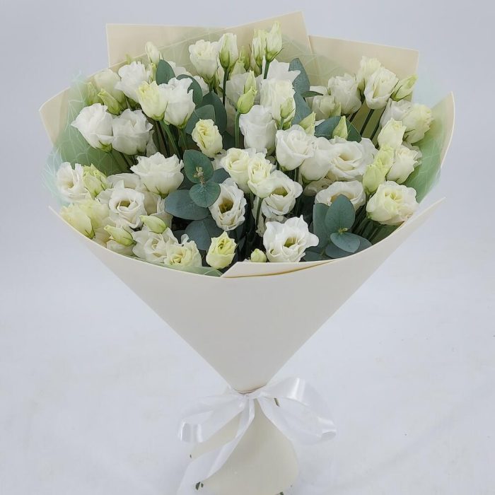 Эустома – 9 шт.Эвкалипт – 5 шт.Пистация – 4 шт.Упаковка дизайнерская – 1 шт.