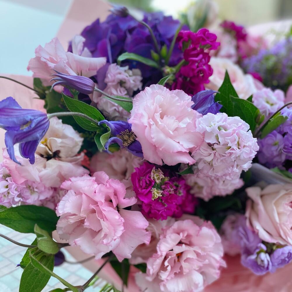 Гортензия – 1 шт.Маттиола – 13 шт.Лизиантус махровый – 10 шт.садовые розы – 9 шт.