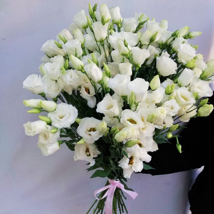 Букет из 29 белых лизиантусов, перевязанный шелковой лентой