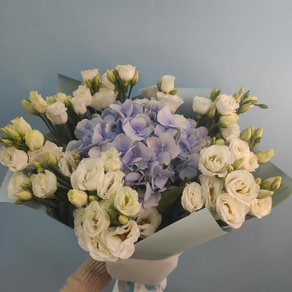 Букет из гортензии, пионовидной розы, эустомы, диантуса, кустовой розы и альстромерии "Летняя нежность"