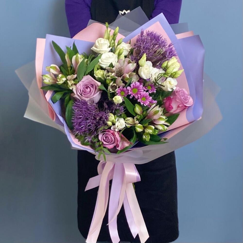 Букет с сиреневыми розами и аллиумом