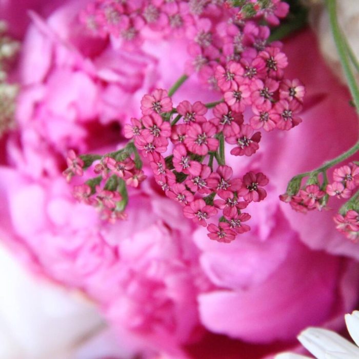 Ромашка – 3 шт.Пион – 3 шт.Львиный зев – 2 шт.Ахиллея – 1 шт.Лизиантус – 2 шт.Амми – 1 шт.Ветки малины – 3 шт.Маттиола – 1 шт.Фисташка – 2 шт.Упаковка – 1 шт.Лента – 1 шт.