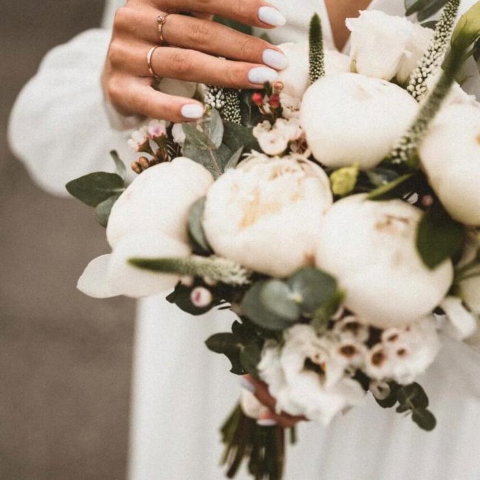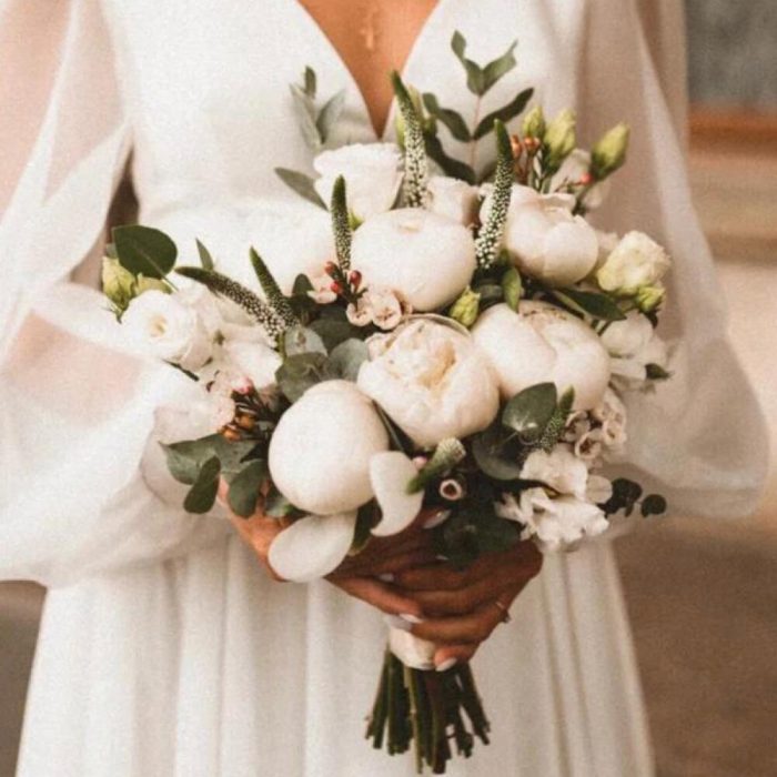 пионы – 9 шт.Ваксфлауэр белый – 2 шт.Вероника – 5 шт.Лента атласная – 5 шт.Лизиантус Алиса белый – 2 шт.Эвкалипт Baby Blue – 1 шт.