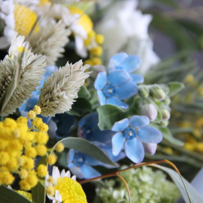 Душистый, весенний букет с мимозой, твидией, генистой, сантини, вибурнумом, канареечником и эвкалиптом.