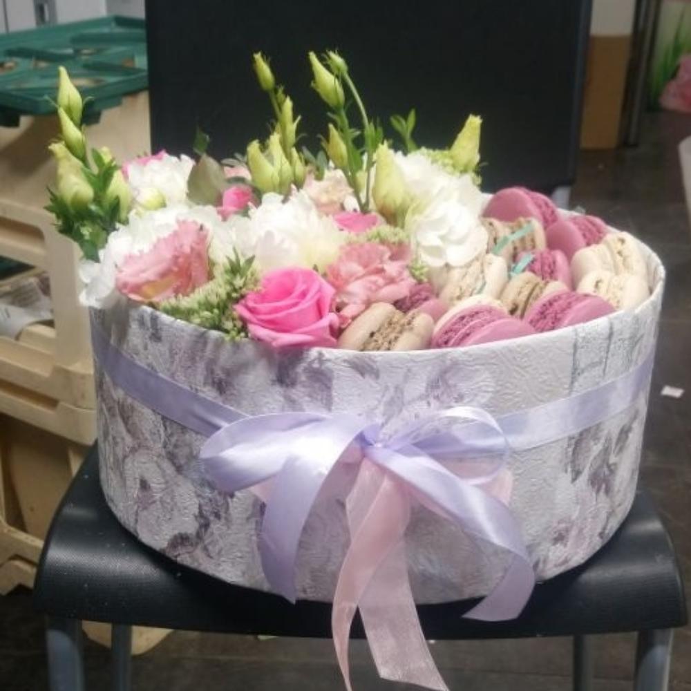 маккаруны – 15 шт.розы – 9 шт.Эустома – 5 шт.Коробка шляпная – 1 шт.
