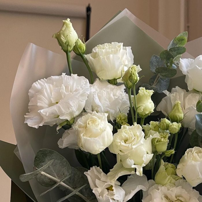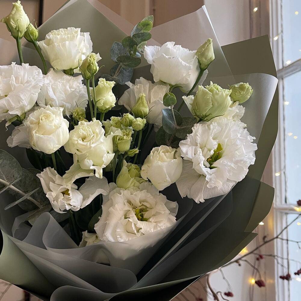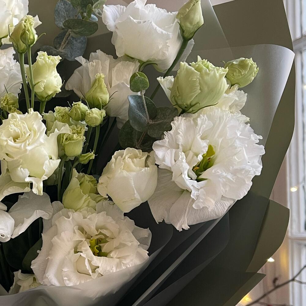 Лизиантус – 3 шт.Эвкалипт – 2 шт.Упаковка дизайнерская – 2 шт.Лента атласная – 2 шт.