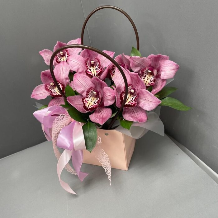 Орхидеи – 7 шт.Рускус – 3 шт.Сумочка – 1 шт.Оазис флористический – 1 шт.Оформление лента – 2 шт.