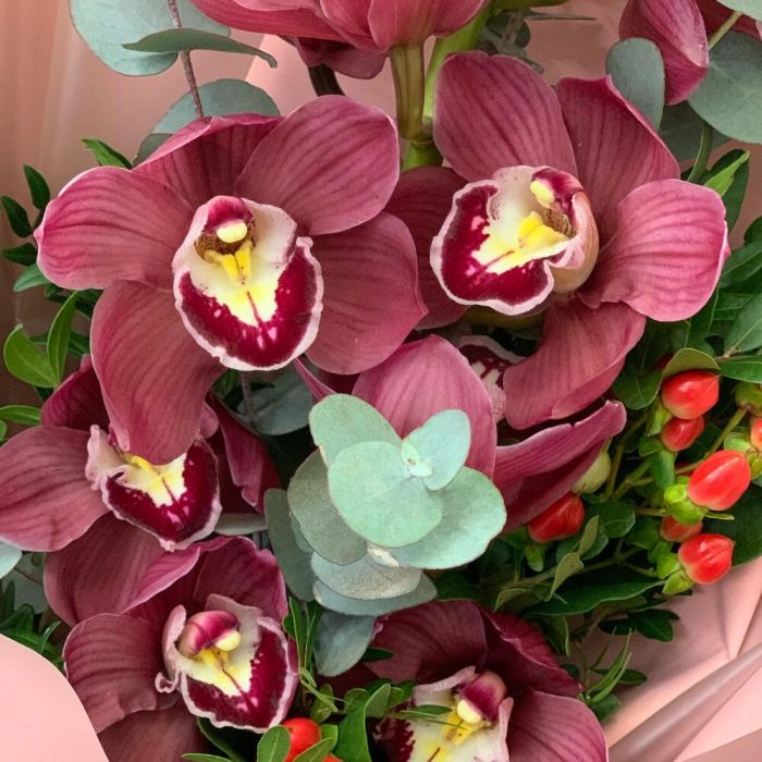 орхидея – 1 шт.Эвкалипт – 1 шт.Зелень – 2 шт.Гиперикум – 1 шт.Дизайнерская упаковка – 1 шт.