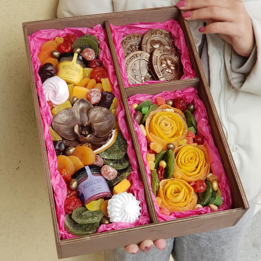 арахис в кунжуте – 160 гр.арахис в белом шоколаде – 100 гр.ананас кубики – 165 гр.арахис в сахарной глазури – 100 гр.Фундук – 100 гр.Крем мед – 2 шт.шоколадная орхидея – 1 шт.Киви – 145 гр.Курага – 72 гр.кизил – 90 гр.Финики – 42 гр.долька апельсина – 1 шт.кумкват в сахарной пудре – 25 гр.манговые конфеты – 2 шт.Папайя – 40 гр.манго вяленый – 107 гр.арахис в темном шоколаде – 80 гр.Кешью – 15 гр.грецкий орех в шоколаде – 30 гр.шоколадные подковы с пожеланиями – 4 шт.манго в сахаре – 100 гр.Деревянная надпись – 1 шт.