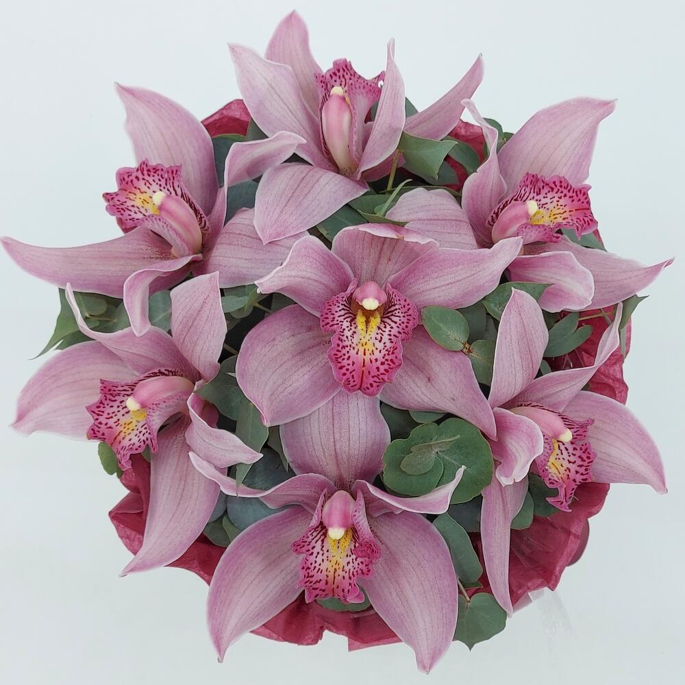 Орхидея цимбидиум бутон – 7 шт.Эвкалипт – 3 шт.Коробка цилиндр – 1 шт.Тишью – 1 шт.Лента репсовая – 1 шт.Лента органза – 1 шт.Флористическая губка (оазис) – 1 шт.