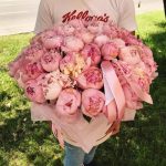 Лента атласная – 3 шт.Пион Сара Бернар – 51 шт.Оазис флористический – 3 шт.коробка шляпная xl – 1 шт.
