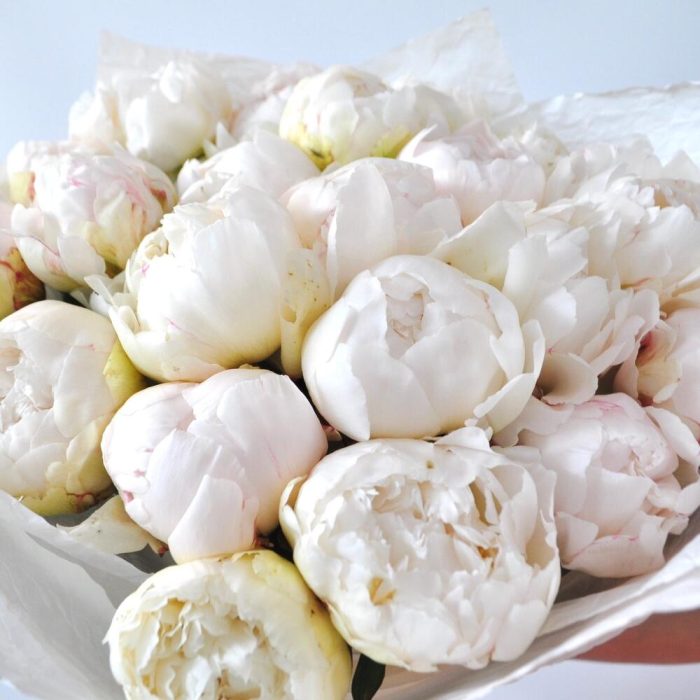 Лента атласная – 1 шт.Крафт – 3 шт.Пион белый – 21 шт.