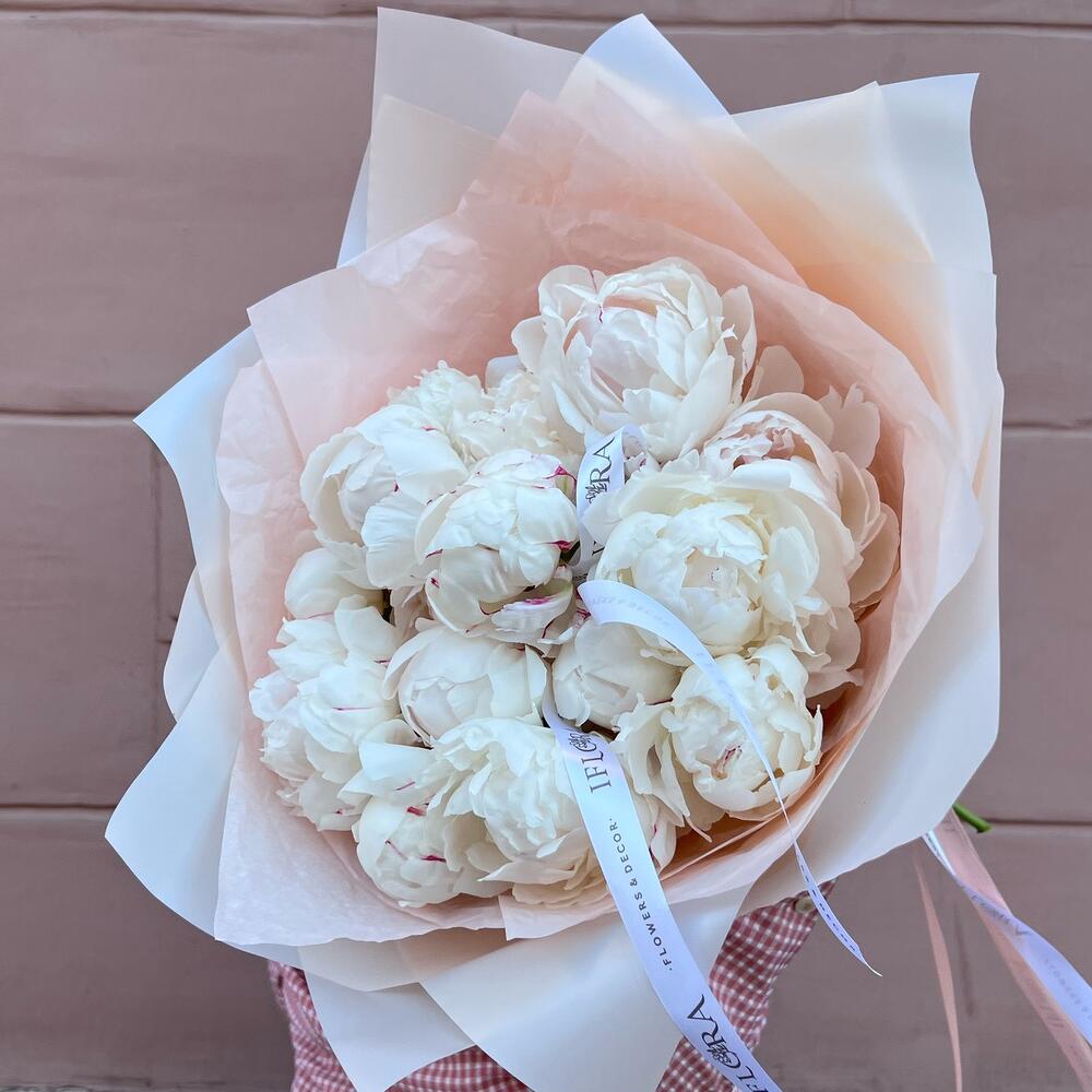 Пион – 15 шт.Лента атласная – 3 шт.Дизайнерская упаковка – 1 шт.