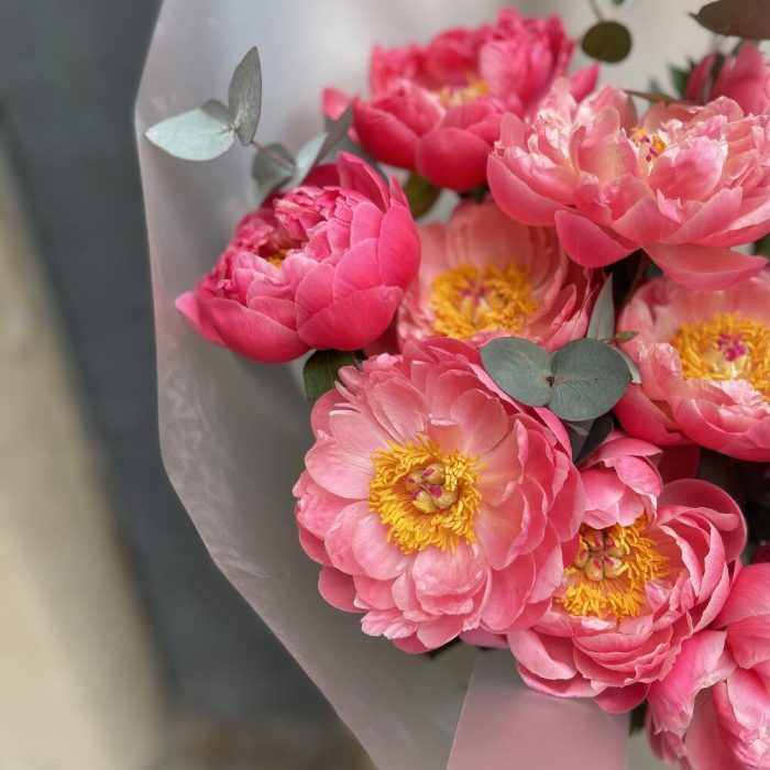 Большая охапка пионов корал шарм с эвкалиптом / 1366 id