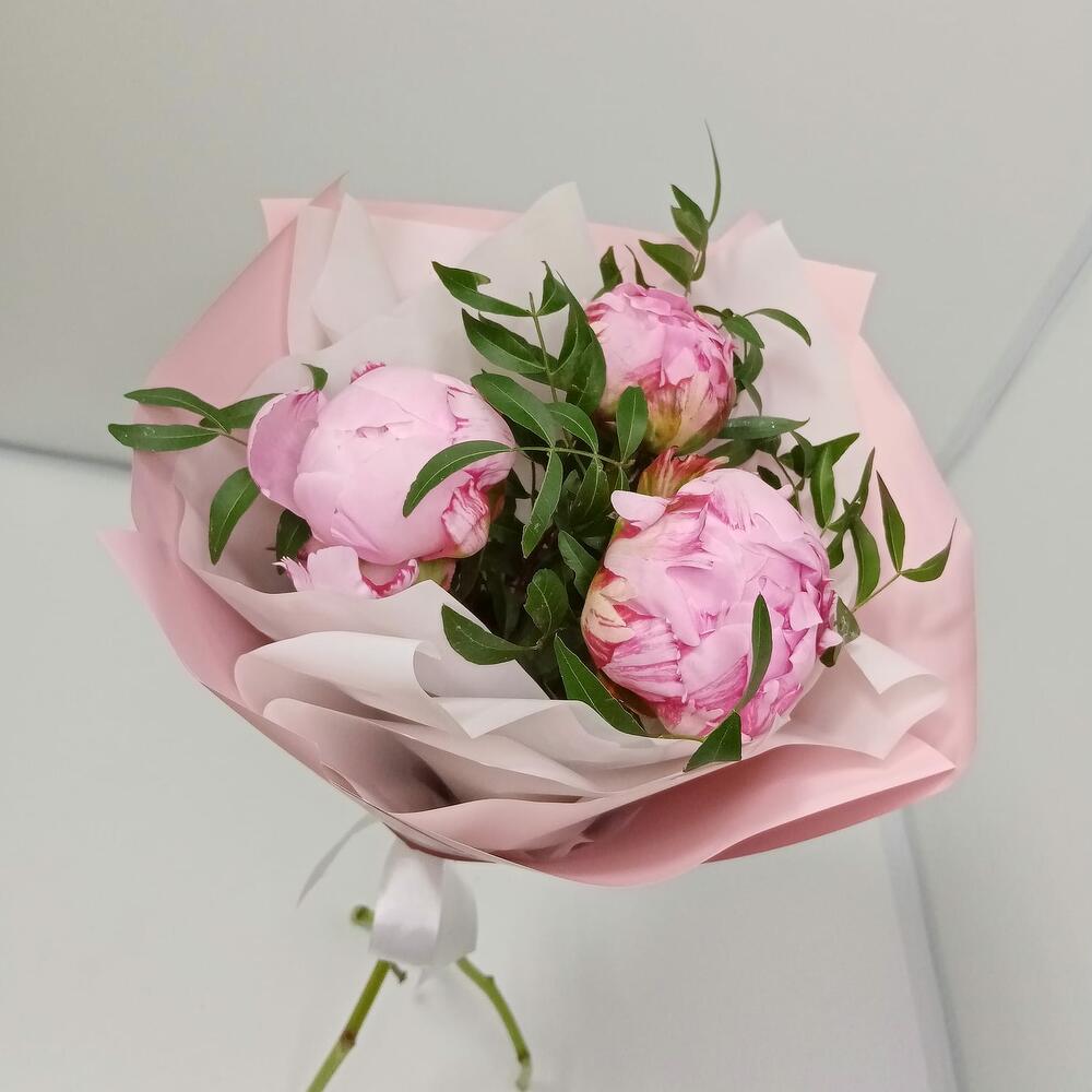 Пион Сара Бернар – 3 шт.Дизайнерская упаковка – 1 шт.зелень фисташки – 1 шт.