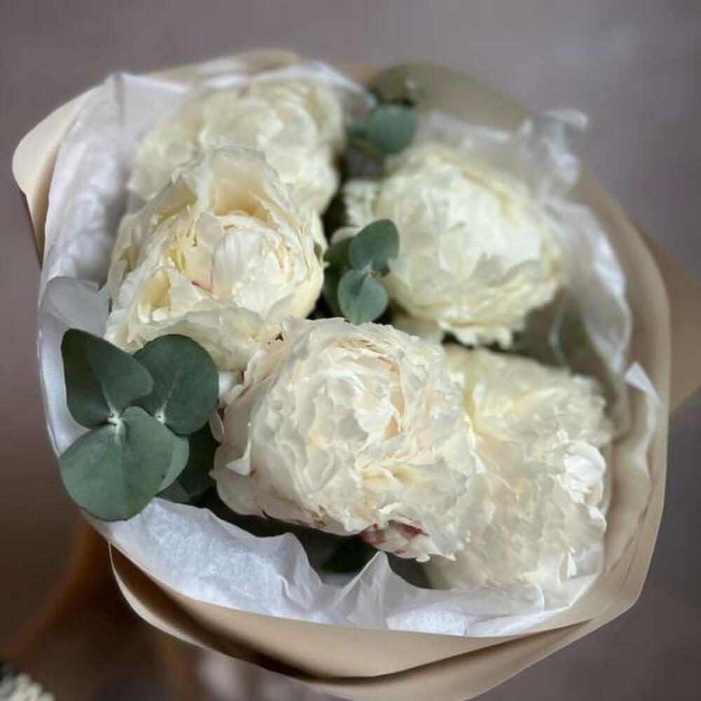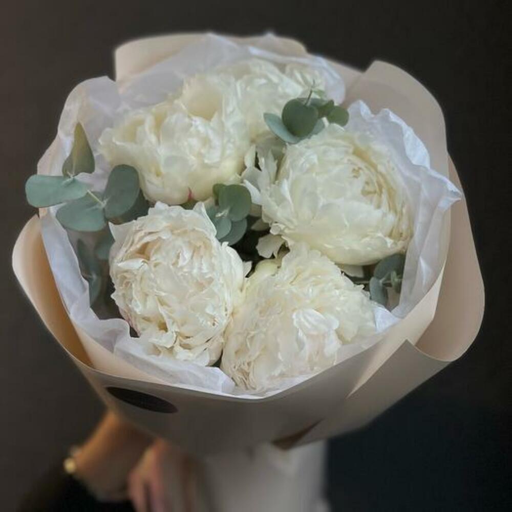 Эвкалипт – 5 шт.Атласная лента – 1 шт.декоративная упаковка – 1 шт.пионы – 5 шт.