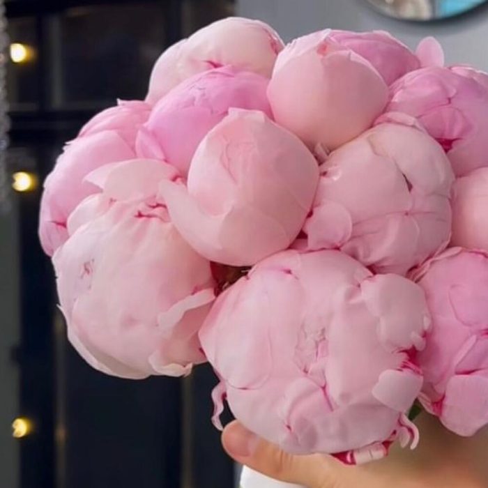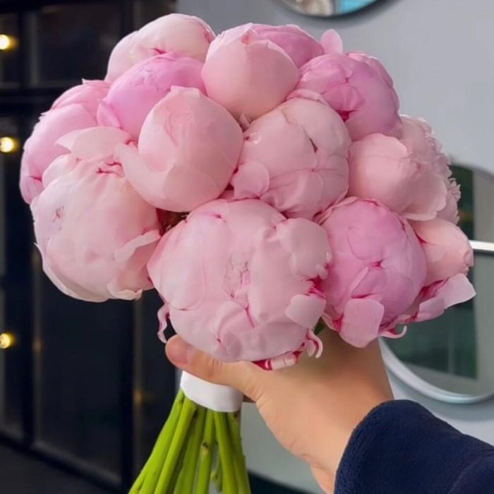 Пион розовый – 15 шт.Упаковка дизайнерская – 1 шт.Лента атласная – 2 шт.Открыточка с вашими пожеланиями – 1 шт.хорошее настроение – 100 шт.инструкция по уходу за цветами – 1 шт.коробка переноска – 1 шт.Кризал – 1 шт.