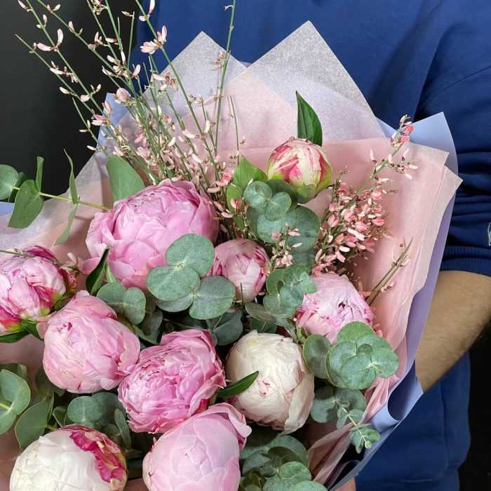 Упаковка – 1 шт.Гениста – 2 шт.эвкалипт синерея – 3 шт.пионы сара бернар – 9 шт.