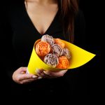 Букет из шоколадных пионов оранжево-сиреневый в дизайнерском желтом картоне