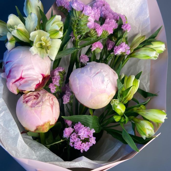 Упаковка – 1 шт.Альстромерия белая – 3 шт.Пион розовый – 3 шт.Статица розовая – 1 шт.