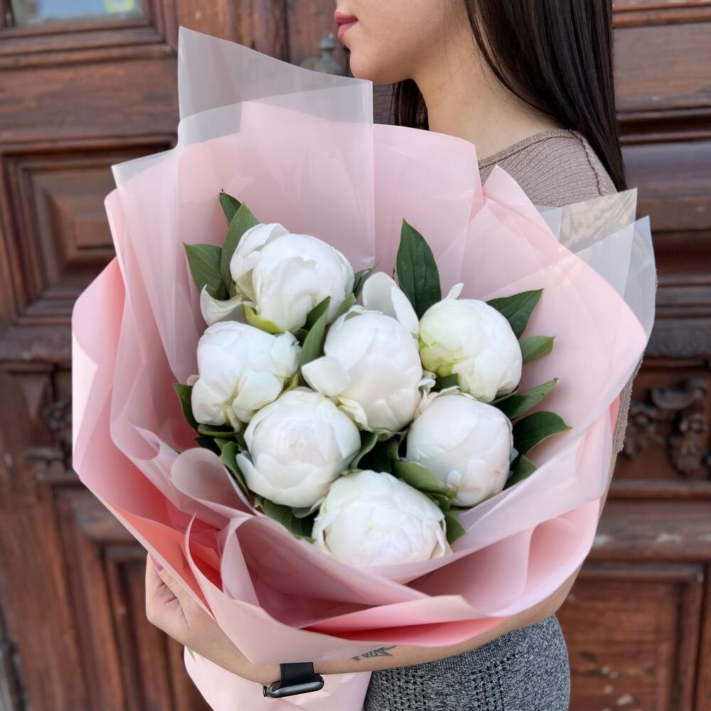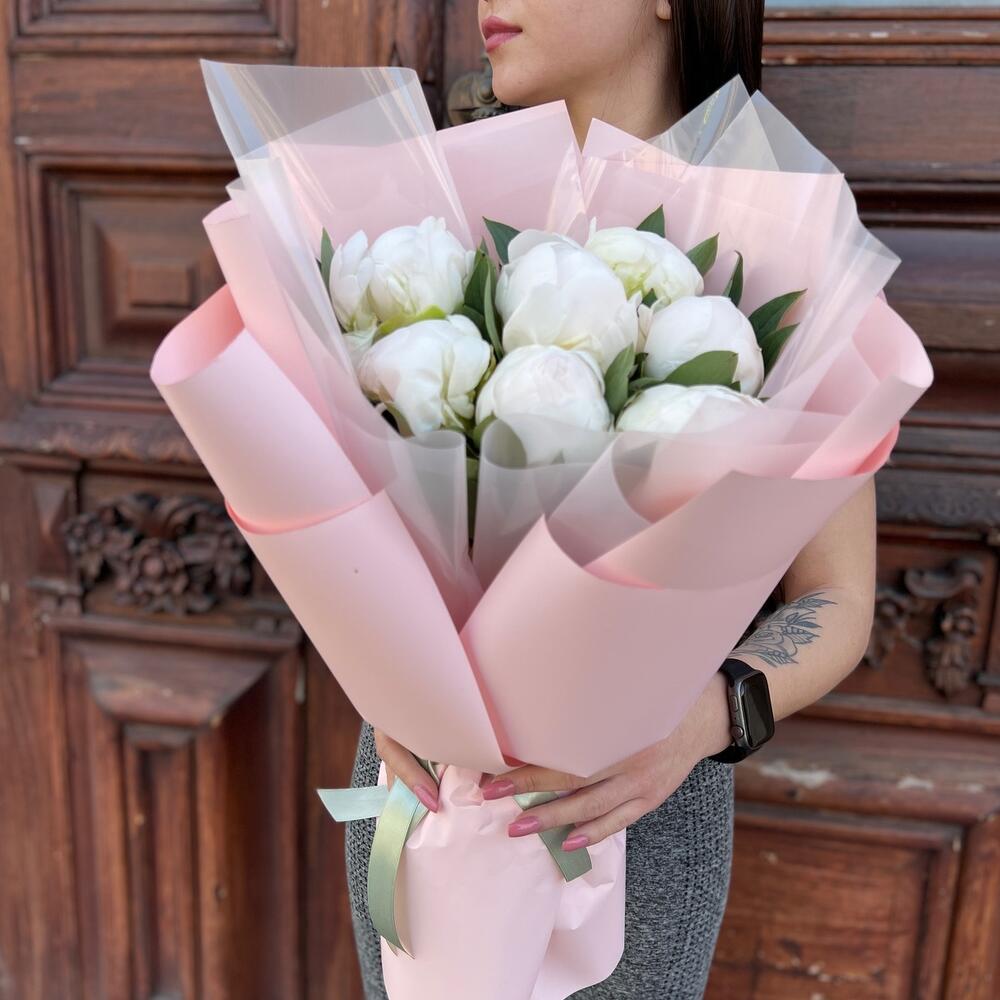 Лента атласная – 2 шт.Пленка матовая – 5 шт.пион мадам клод тейн – 7 шт.пленка полупрозрачная – 4 шт.
