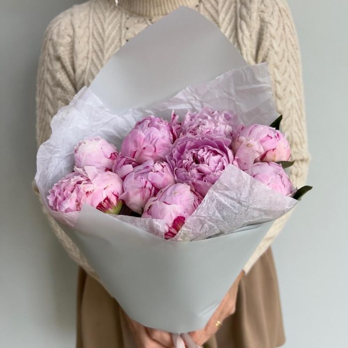 Пион – 9 шт.Тишью белое – 2 шт.Пленка дизайнерская – 2 шт.