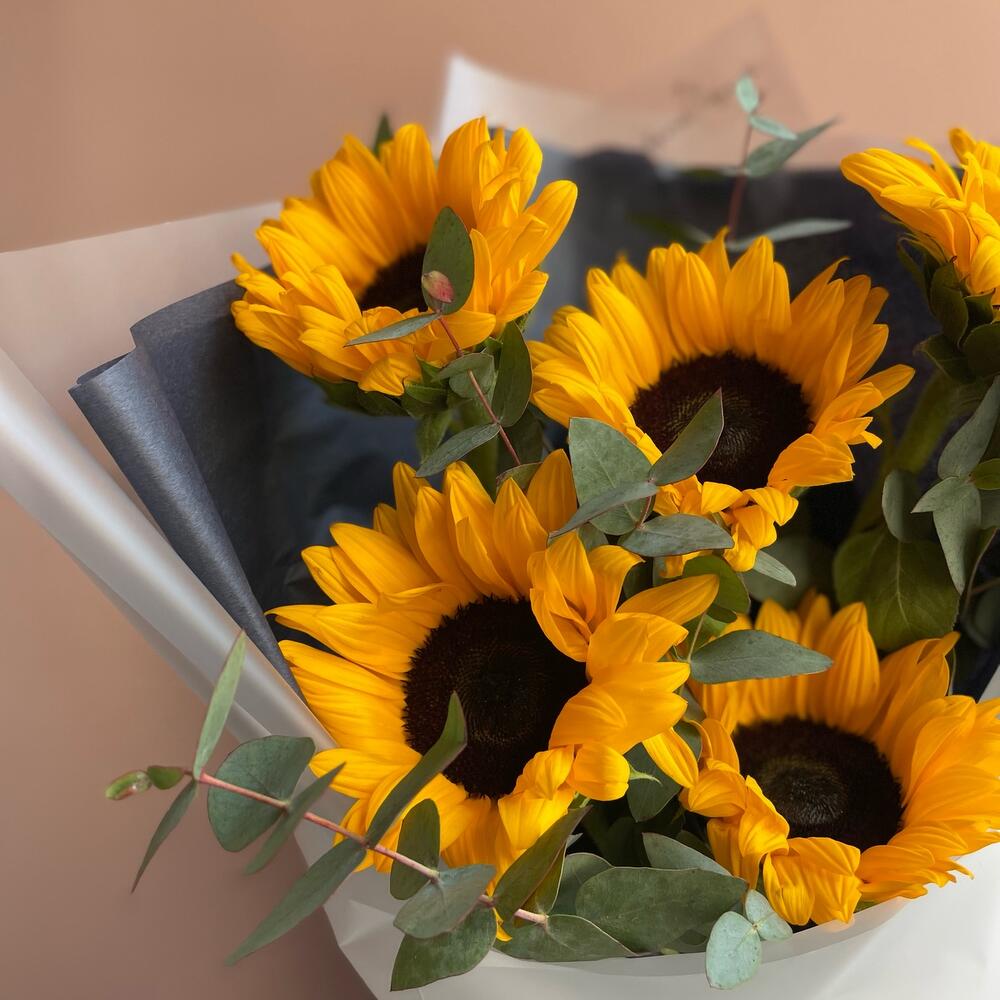 Эвкалипт – 2 шт.Лента атласная – 1 шт.Тишью – 2 шт.Подсолнух – 5 шт.Пленка матовая – 1 шт.