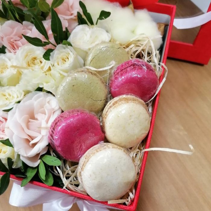 Кустовая роза – 5 шт.Коробка подарочная – 1 шт.Фисташка – 1 шт.Хлопок натуральный – 2 шт.эустома белая – 3 шт.Макарон – 6 шт.Губка флористическая – 1 шт.