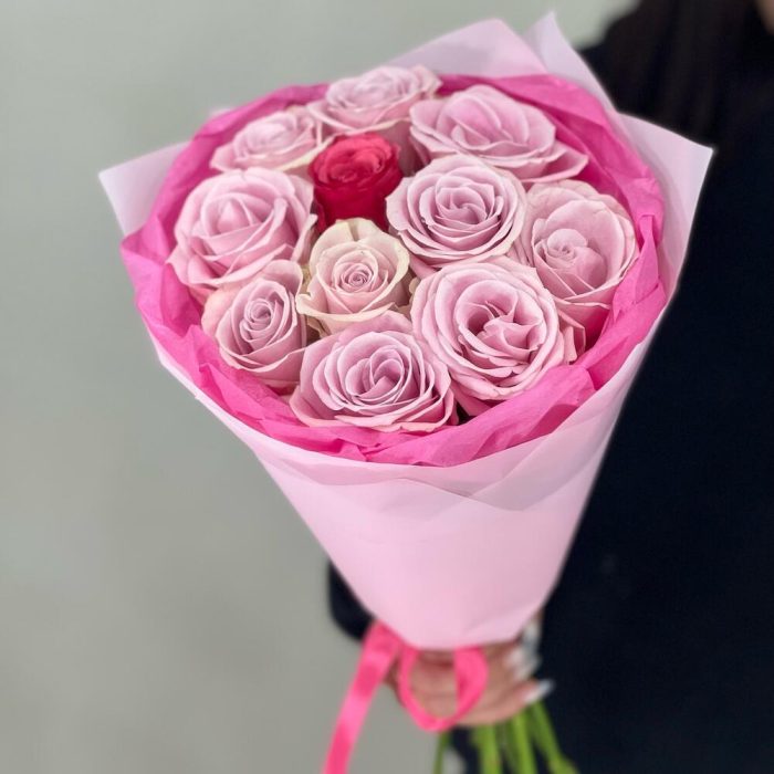Лента атласная – 1 шт.Упаковка дизайнерская – 1 шт.роза нежно розовая кения – 10 шт.роза яркая кения – 1 шт.