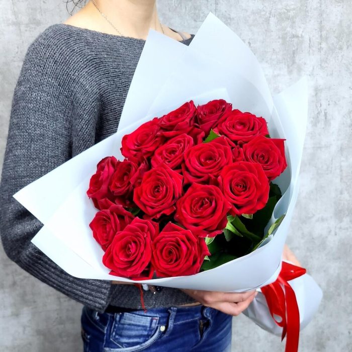 Лента – 1 шт.Упаковка – 1 шт.Роза красная 60 см – 15 шт.