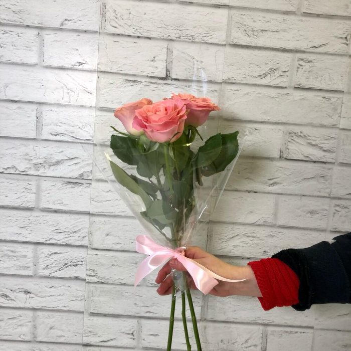 Упаковка – 1 шт.Лента атласная – 1 шт.Роза нежно розовая – 3 шт.