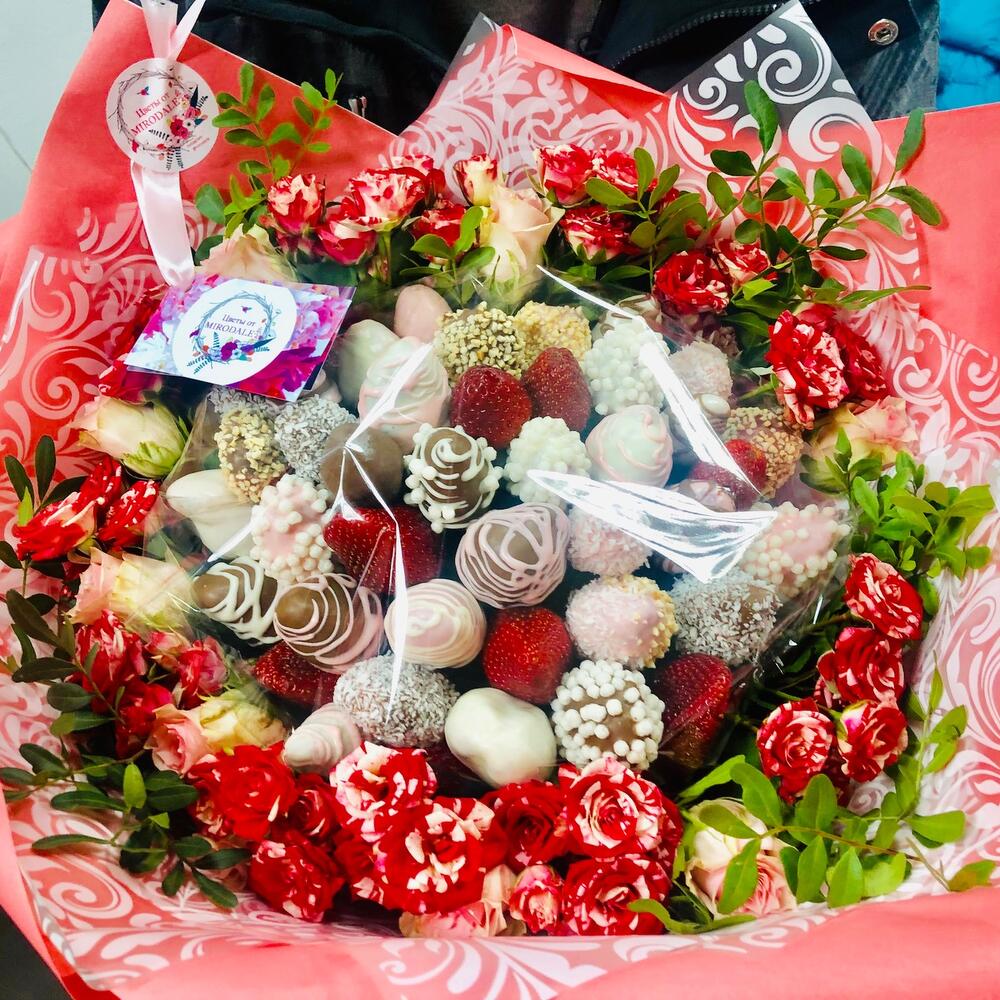Роза кустовая – 10 шт.Роза – 9 шт.Зелень – 1 шт.Упаковка дизайнерская – 1 шт.Клубника в шоколаде – 1000 гр.