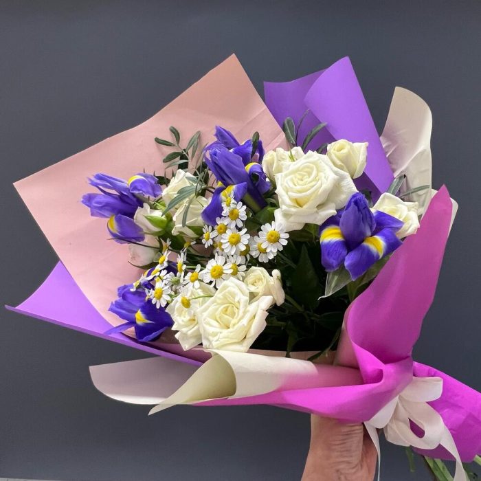 Роза – 3 шт.Ирис – 5 шт.Матрикария – 1 шт.Фисташка – 1 шт.Упаковка дизайнерская – 1 шт.