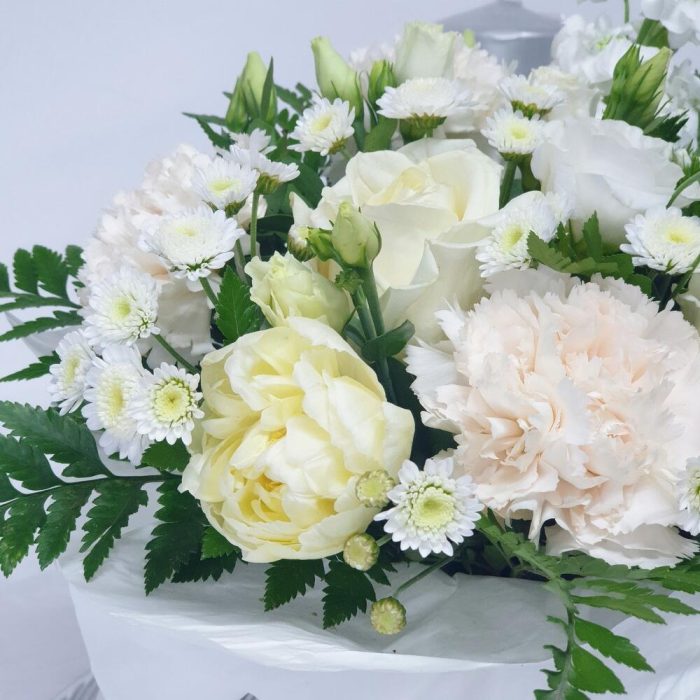 роза белая крупная – 2 шт.Маттиола белая – 1 шт.эустома белая – 1 шт.гвоздика белая сортовая – 3 шт.тюльпаны белые – 3 шт.папоротник ветка – 2 шт.сантини хризантема кустовая – 1 шт.Коробка шляпная с принтом – 1 шт.Лента атласная – 2 шт.Оазис флористический – 1 шт.Открыточка с вашими пожеланиями – 1 шт.