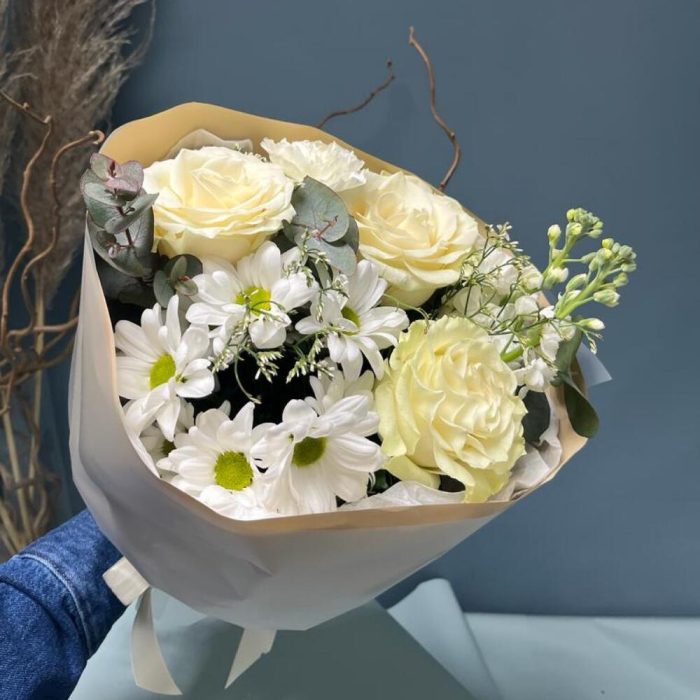 Лимониум – 1 шт.Маттиола – 2 шт.Хризантема кустовая – 1 шт.Эвкалипт – 3 шт.Роза одноголовая – 3 шт.Гвоздика – 2 шт.Упаковка дизайнерская – 2 шт.