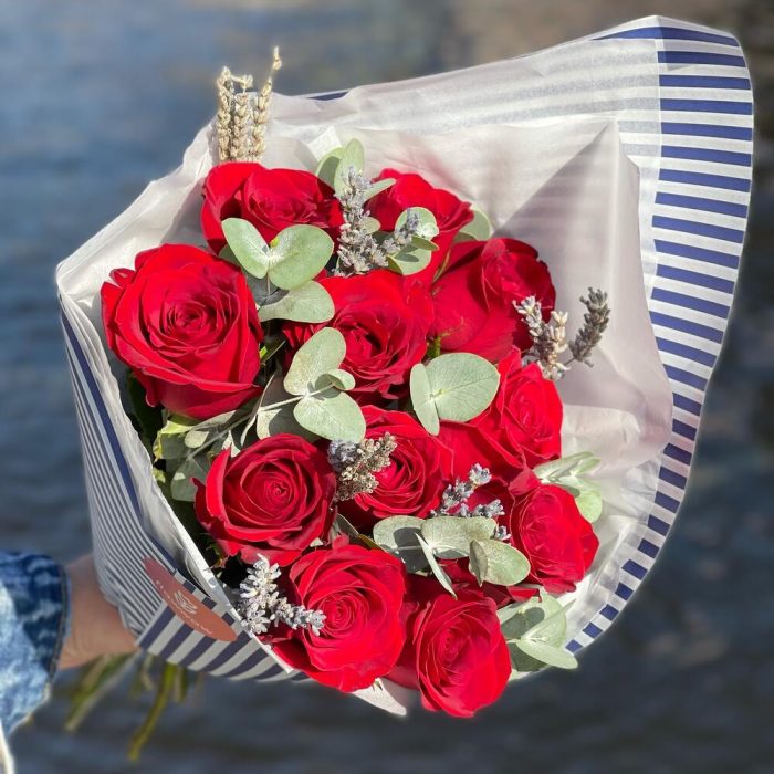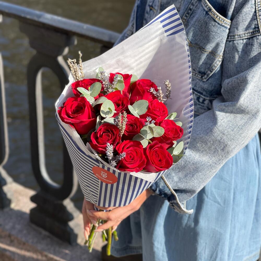 Лента – 1 шт.Упаковка дизайнерская – 1 шт.Роза красная 40 см – 11 шт.