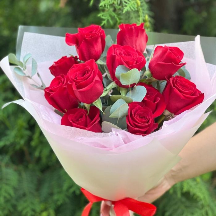 Роза фридом 50 см – 11 шт.Эвкалипт – 3 шт.Дизайнерская упаковка – 2 шт.